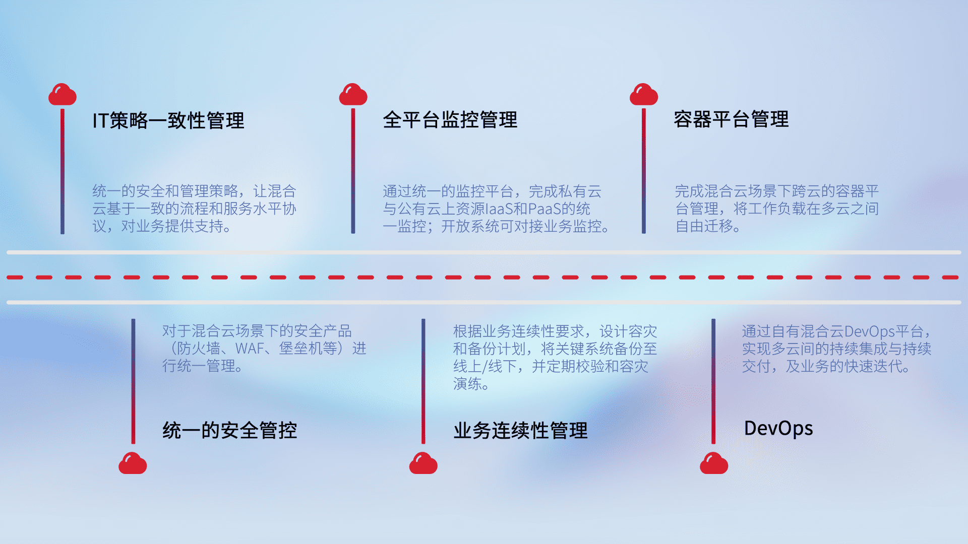 通过多云纳管,,,以统一的资源数据模型把客户的云资源进行抽象和封装,,进而实现对多云资源的统一操作,,,,保障云资源管理的可靠性、、、稳定性与可用性。。量身定制化运维内容,,,,配置、、、开发运维、、、补丁管理、、、、备份、、、、监控、、、、认证和访问管理、、、审计和日常巡检等,,,,保障在用云过程中的可靠度,,,,稳定度以及高可用率。。。